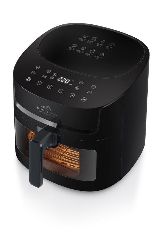Bereiten Sie Ihre Lieblingsspeisen auf gesündere Weise zu – fast ganz ohne Öl! Die Heißluftfritteuse ETA Fritta Spectra frittiert, backt und trocknet mit Heißluft, die gleichmäßig um Ihre Speisen zirkuliert. Dank des transparenten Sichtfensters und der Innenbeleuchtung haben Sie stets den perfekten Überblick über den Garvorgang – ganz ohne unnötiges Öffnen.