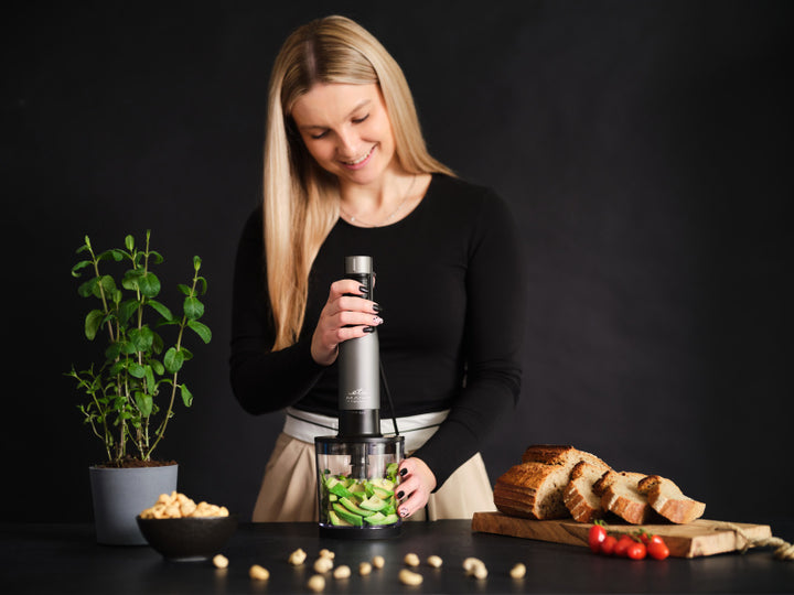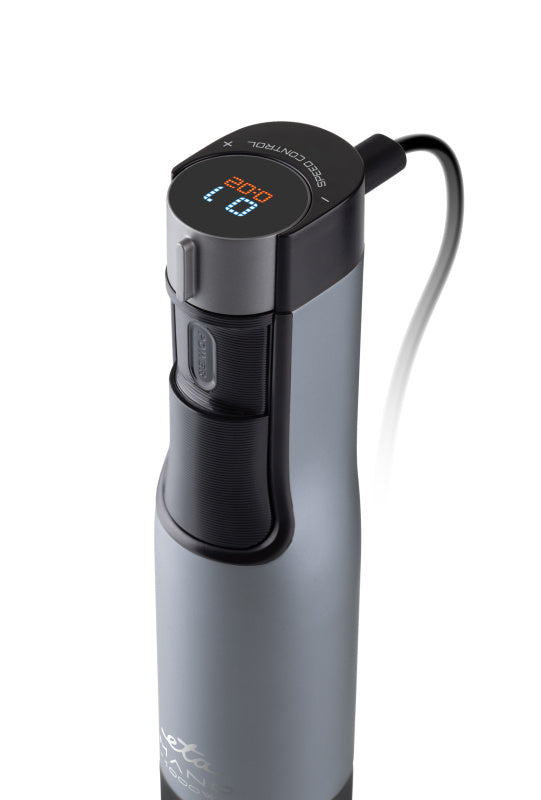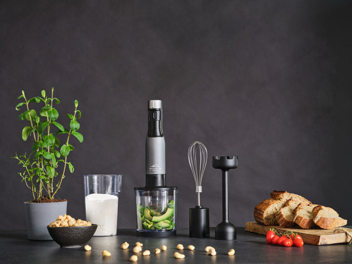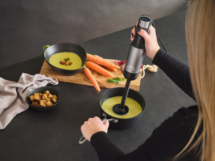 Leistungsstarker Stabmixer mit DC-Motor und 1000 W Leistung im eleganten Metallic-Design und umfangreichem Zubehör.