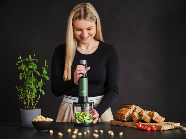 Im Lieferumfang enthalten ist auch ein praktischer Zerkleinerer mit scharfem Sichelmesser, der problemlos auch härtere Lebensmittel wie Nüsse, Gemüse oder Obst bewältigt. Möchten Sie Zwiebeln und Kräuter hacken oder Pesto selber machen? Kein Problem! Dieser Stabmixer ETA ist bereit für alle Ihre kulinarischen Herausforderungen.